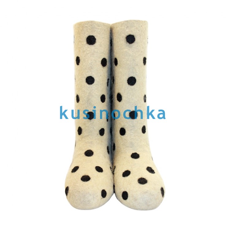 Классика в современном исполнении: светлые (бежево-молочные) валенки с аккуратными чёрными кружочками. Нейтральный, но выразительный узор подходит как девочкам, так и мальчикам — он не диктует образ, а дополняет его: спокойный, но не скучный; модный, но не вычурный.