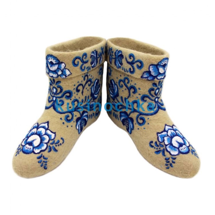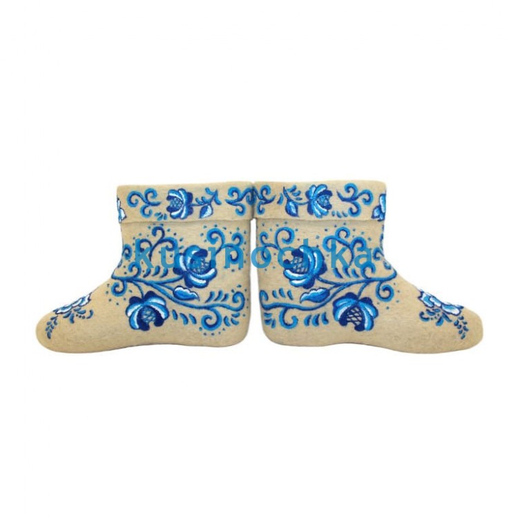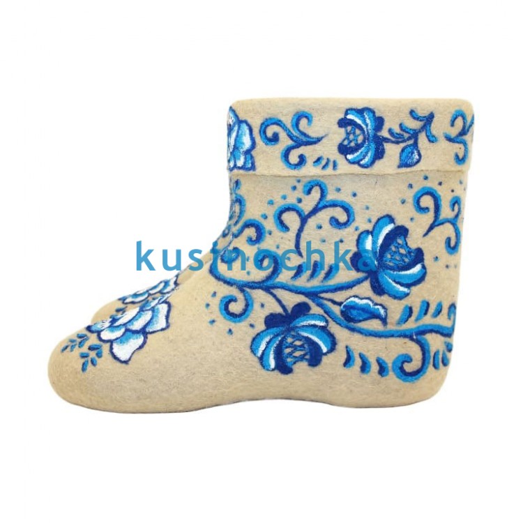 Рисунок наносится вручную — с соблюдением ритма и пропорций, но без копирования конкретного изделия гжельских мастеров. Это дань традиции, а не реплика: каждый элемент адаптирован под форму валенка, с учётом изгибов и объёма.