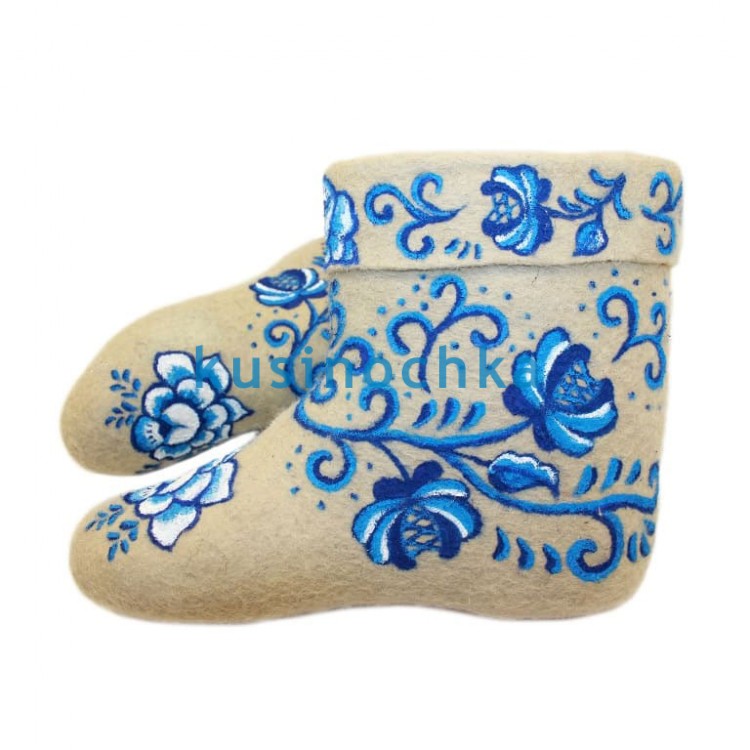 Полуваленки ручной валки на светлой основе, с декоративным рисунком, выполненным акриловыми красками в стилистике гжельской росписи: синие и тёмно-синие узоры на белом или молочном фоне — волны, завитки, цветочные мотивы, стилизованные под классический народный орнамент.
