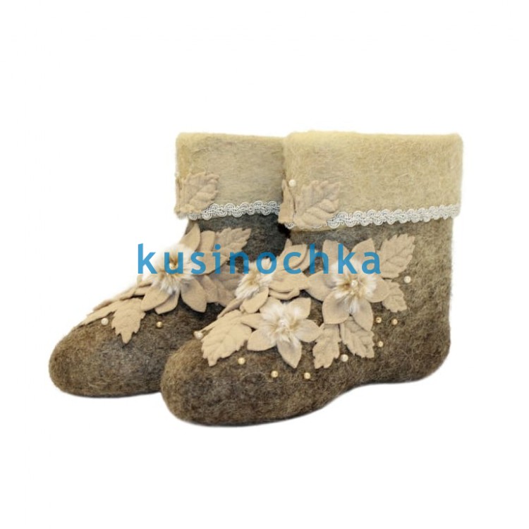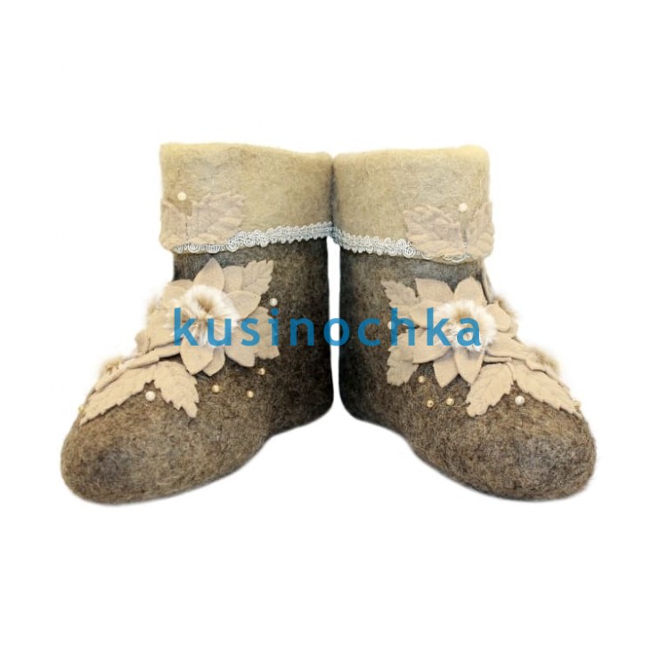 Полуваленки ручной валки на серой основе, с светлыми отворотами. Главный акцент — объёмная аппликация в виде роз, выполненная методом художественного валяния из натуральной шерсти. Лепестки слегка возвышаются над поверхностью, сохраняя мягкость и естественную текстуру — их можно трогать, гладить, чувствовать.