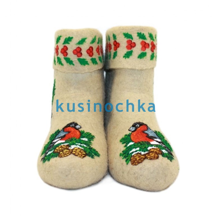 Полуваленки ручной валки на светлой основе, с художественным рисунком, передающим тихую зимнюю сцену: на передней части — пара снегирей на заснеженной еловой ветке, на отворотах — веточка рябины с ягодами. Композиция выдержана в природной гамме: белый и серо-голубой (снег, ветви), насыщенный красный (грудки птиц, ягоды), тёмно-зелёный (хвоя), чёрный (контур, детали оперения).