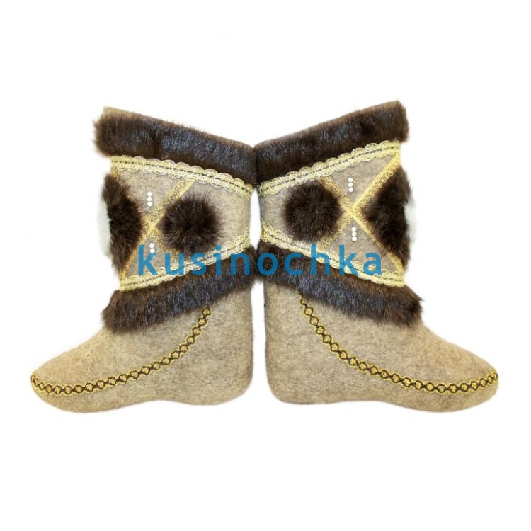 Полноразмерные валенки ручной валки на светлой основе, с отделкой золотисто-чёрной тесьмой, опушкой из натурального меха и меховым узором на теле валенка (например, стилизованная корона, цветок или геральдический мотив — по исполнению).
