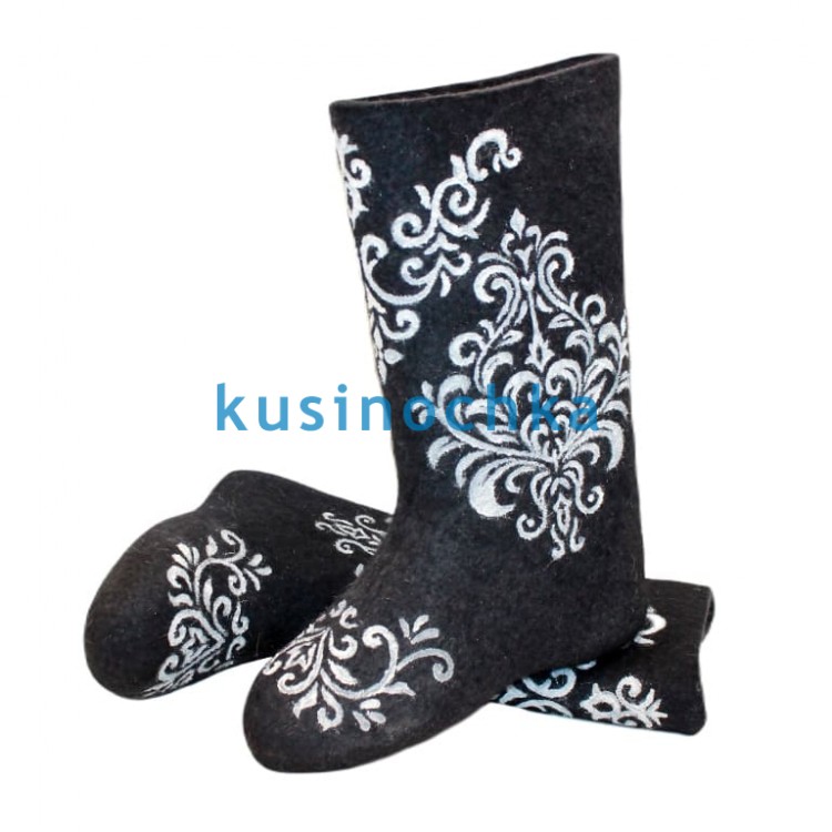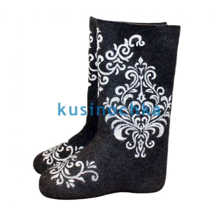 Полноразмерные валенки ручной валки на чёрной основе, с абстрактным узором, выполненным белой акриловой краской. Композиция — геометрические повторы, линии, завитки или стилизованные растительные мотивы — выстроены с акцентом на ритм и баланс. Контраст чёрного и белого создаёт эффект графичной чёткости без агрессии.
