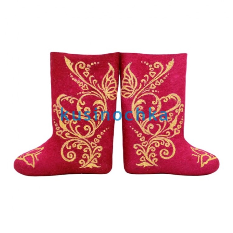 Полноразмерные валенки ручной валки на красной основе, с абстрактным растительным орнаментом, выполненным золотистой акриловой краской (матовый пигмент, без блёсток). Узор — волны, завитки, намёки на колосья или листья — выдержан в сдержанной, почти графической манере. Золото работает как акцент, а не как доминанта: теплое, но не кричащее.