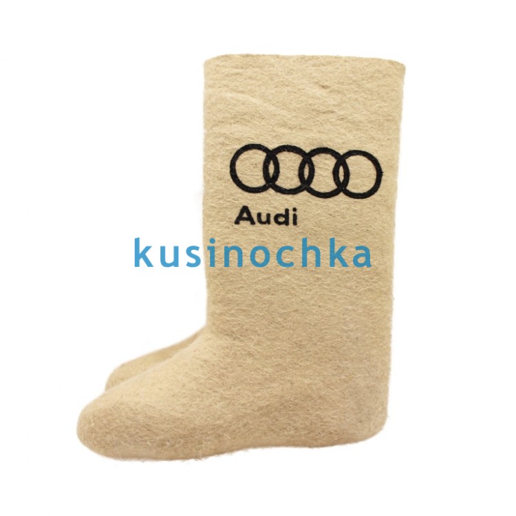 Валенки ручной валки, предназначены для персонализации под индивидуальный заказ — в том числе с нанесением логотипов, названий брендов, слоганов или эмблем по предоставленному клиентом макету. Пример с надписью «AUDI» иллюстрирует реализацию заказа для корпоративного клиента (например, дилерского центра, клуба владельцев, партнёрской программы), с соблюдением требований к фирменному стилю.