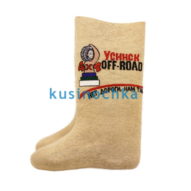 Валенки ручной валки, предназначены для индивидуального брендирования под задачи заказчика. Пример с надписью «Усинск Off-road» демонстрирует возможность нанесения любых текстовых и графических элементов: логотипов, названий компаний, девизов, слоганов, названий мероприятий, именных надписей и пр.