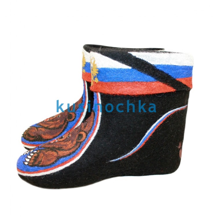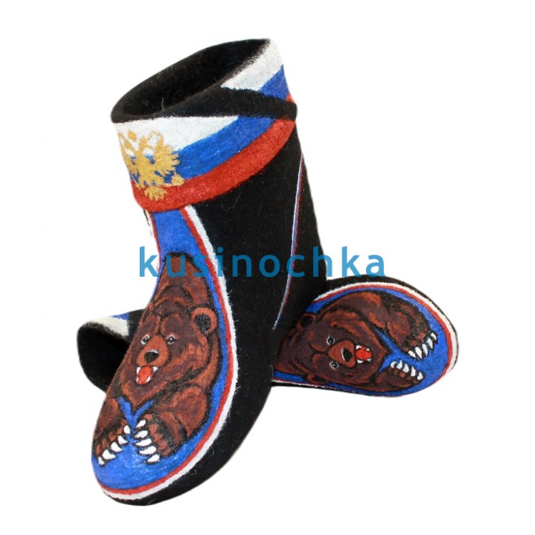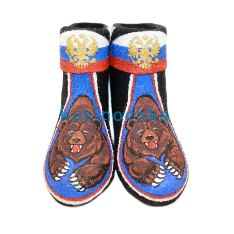 на задней части (пятках) — отпечаток медвежьей лапы, как символ следа, присутствия, связи с землёй.