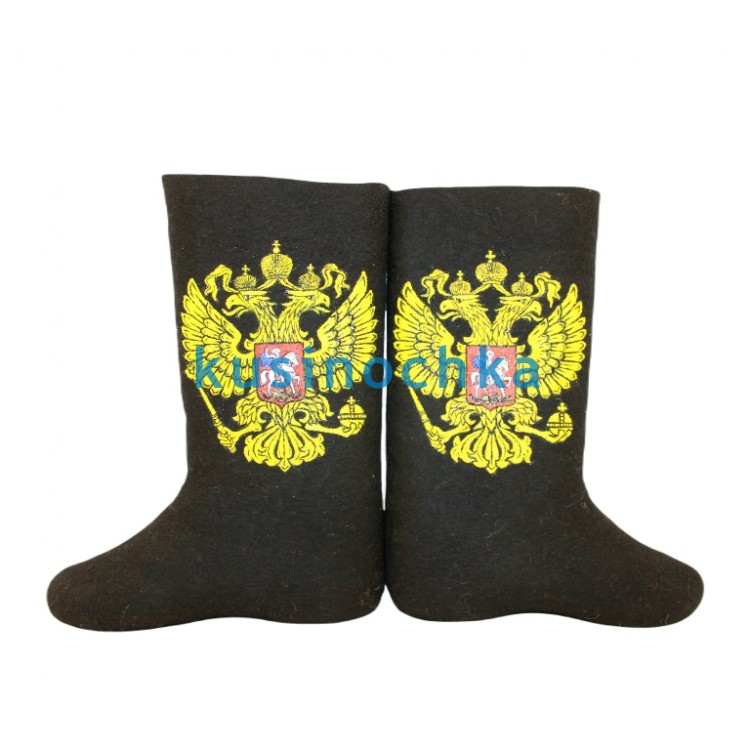 Полноразмерные валенки ручной валки на чёрной основе, с центральным элементом — гербом Российской Федерации, выполненным в соответствии с официальным описанием. Герб расположен на передней части валенка, в верхней трети — для лучшей читаемости. Фон остаётся чистым, чтобы символ оставался фокусом.