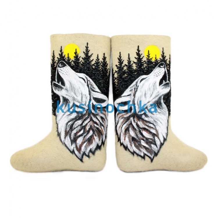 Полноразмерные валенки ручной валки на светлой основе, с художественным рисунком: волк, обращённый к луне, за которой — силуэты тёмного леса. Композиция выдержана в графичной, почти силуэтной манере: луна — круглая, светлая; лес — вертикальные тени; волк — крупный, с поднятой мордой, но без агрессии — скорее, как символ бодрствования, связи с природой.
